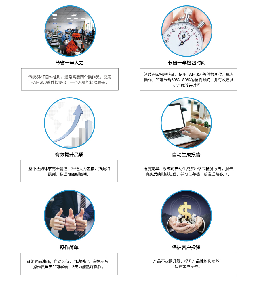 當今SMT電子工廠,多機種、小批量、換線頻,使得首件檢測的任務越發(fā)繁重。傳統(tǒng)的SMT首件檢測方法,不僅浪費人力,效率低下,整個首件檢測過程缺乏管控,品質難以得到保證。針對此難題,深圳市藍眼科技有限公司首創(chuàng)了SMT首件檢測儀,通過不斷升級優(yōu)化,現(xiàn)已研發(fā)出第四代首件檢測儀FAI-650,具有以下顯著優(yōu)勢: